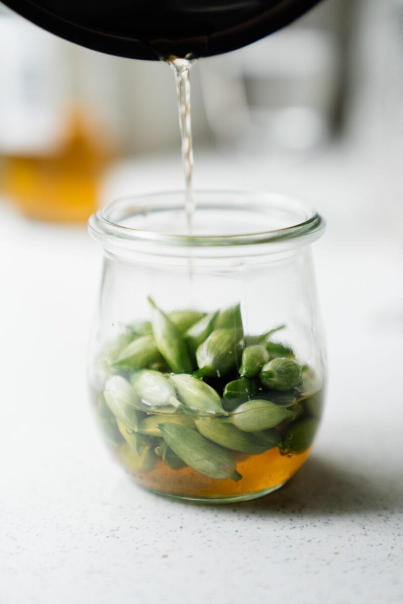 3. Den heissen Sud über die Knospen giessen und das Glas sofort verschliessen.