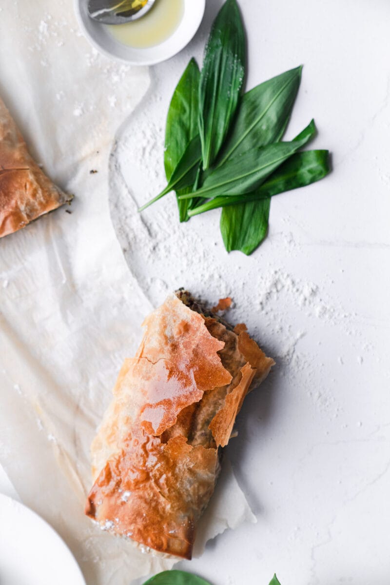 - Im vorgeheizten Backofen bei 200°C Ober- und Unterhitze in der Mitte des Ofens backen, bis der Strudel- oder Blätterteig knusprig geworden ist. Das dauert etwa 30–40 Minuten.